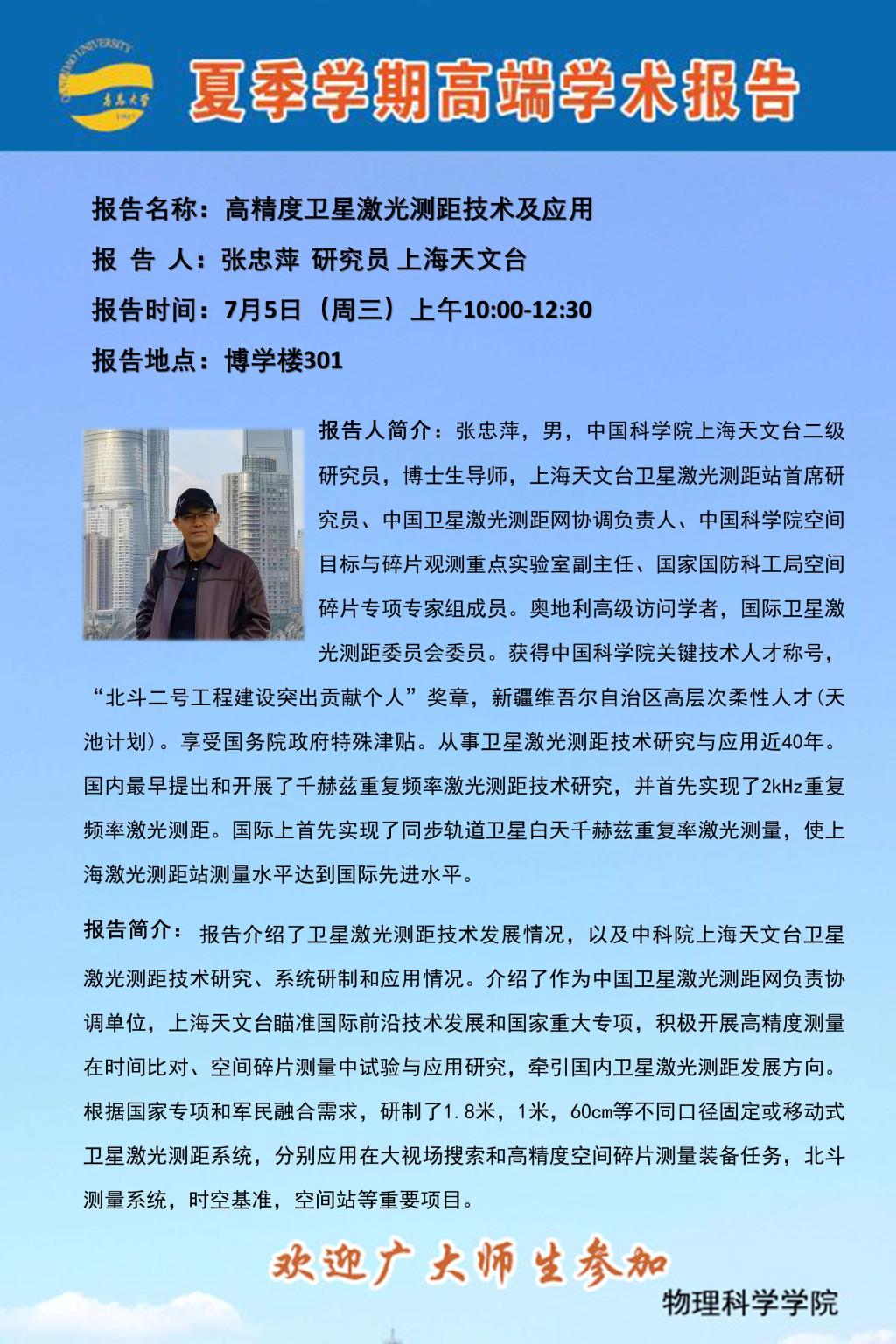 [学术预告]张忠萍-高精度卫星激光测距技术及应用