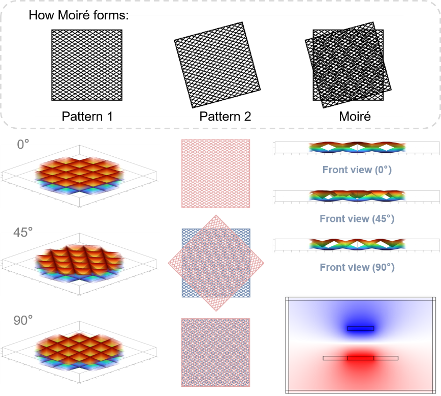 摩擦纳米发电机(TENG)作为一种自供电触觉传感技术,在可穿戴电子和物联网领域具有广阔的应用潜力。针对目前表面工程策略多局限于静态结构设计,难以实现接触界面动态调控的问题,该工作受自然界树叶脉络拓扑结构的启发,利用模板辅助静电纺丝技术在摩擦电层表面构筑了菱形图案化的纳米纤维阵列。该研究通过调节图案化摩擦层间的相对旋转角度,莫尔纹(Moiré)效应诱导接触界面的几何构型演变,进而改变了有效接触面积,成功实现了对器件电学输出性能的动态调控。基于此结构开发的自供电触觉传感器在可穿戴电子器件、人机交互等方面展现了良好的应用前景,为智能感知界面的设计提供了新的思路。