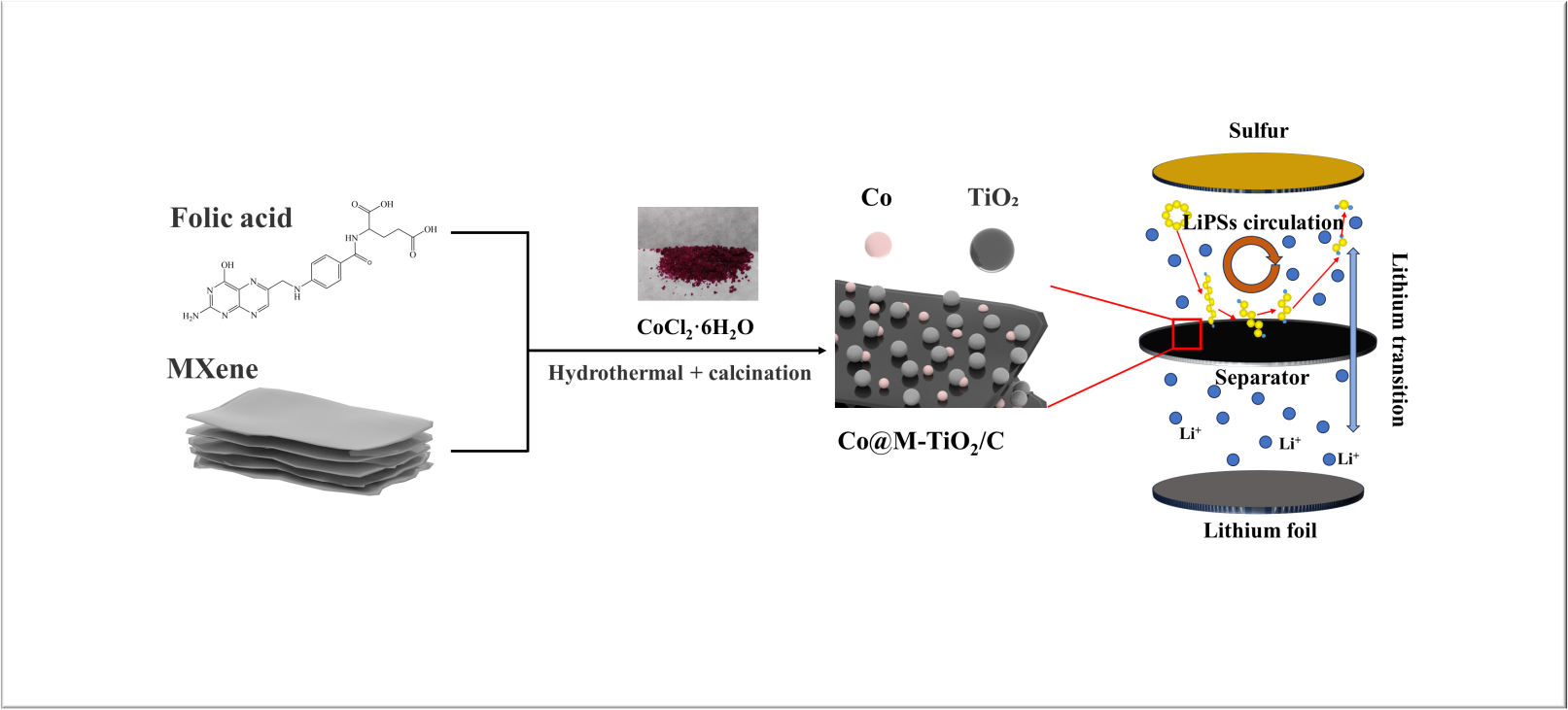 该工作基于Ti3C2 MXene、Co源和叶酸,设计制备了碳片上负载Co单质@MXene衍生TiO2异质结(Co@M-TiO2/C)复合材料,并将其作为多硫化锂催化剂用于改性锂硫电池商用隔膜。该材料具有良好的电子导电性,并呈现多孔互连网络,赋予电极快速的离子扩散和电子转移。Co和MXene衍生双相TiO2形成的异质结构,确保丰富的活性位点和电化学界面,可以有效吸附多硫化锂并催化实现其快速转化,提高了电化学反应动力学,实现了在高硫载量下的循环稳定性。研究生刘文栋为共同第一作者,特聘教授宋建军为本校通讯作者。