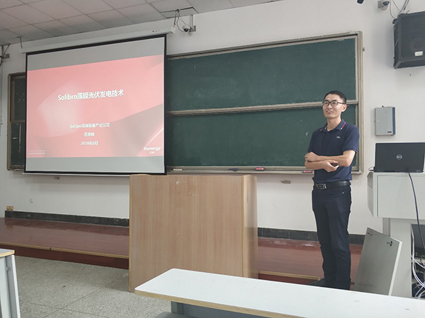 苏青峰在报告中首先介绍了汉能集团的概况,并以汉能集团运营为例介绍了新能源企业的业务范围、企业结构、研发团队和知识产权等方面的情况。随后,他从原理和技术角度介绍了Solibro的产线工艺,讲解了Mo背点极的沉积、P1第一次划刻、CIGS沉积、P2第二次划刻等工艺,让大家对薄膜太阳能发电技术工艺有了一个较为清晰的了解。最后,苏青峰鼓励同学们学好本专业的基础功课,并邀请同学们毕业后到他所在的企业,共同创造美好的未来。